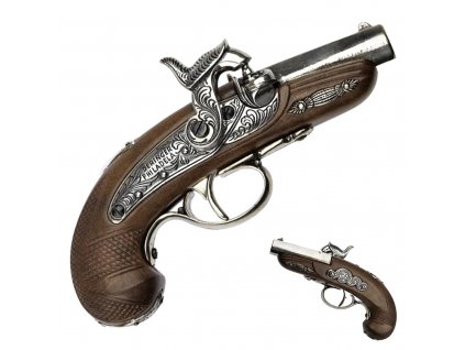 Anglická bambitka "KING OF THE SEVEN SEAS" je veľmi vydarená replika anglickej pištole z prelomu 18. a 19. storočia. Jedná sa o úplne unikátny dekoratívny prvok, ktorý oživí každú izbu či kanceláriu. S touto bambitkou sa budete cítiť ako kráľ všetkých siedmich morí! :-) Anglická bambitka "KING OF THE SEVEN SEAS" je kvalitne vyrobená nádhera bez štipky plastu! Skladá sa len z poctivého kovu a krásneho lakovaného dreva. Bambitka ponúka nádherné kovové detaily vrátane pohyblivého otočného mechanizmu náťahu a spúšte. Rukoväť padne do ruky ako uliata a pištoľ celkovo okolo seba šíri nezabudnuteľnú dobovú atmosféru. 100% made in Italy! Anglickú bambitku "KING OF THE SEVEN SEAS" možno vďaka zlatému očku na konci rukoväte zavesiť na stenu a kochať sa ňou z diaľky, kedykoľvek ju práve nebudete mať v ruke. Je skrátka trefou do čierneho pre každého zberateľa aj nadšencov :-)