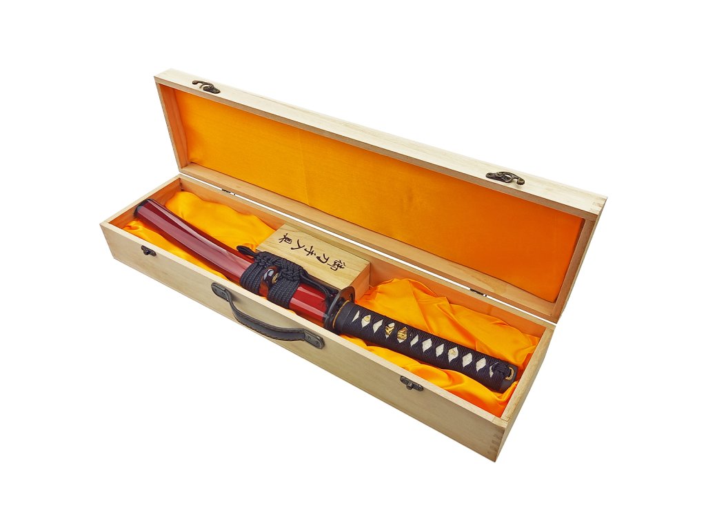 Červené samurajské tanto "Kunimitsu" s dreveným boxom