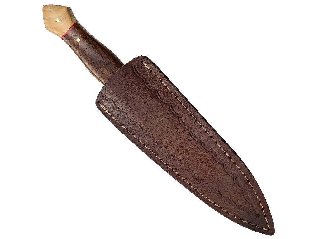 | Materiál: | Damašková oceľ 1095 a 15N20, tropické drevo, nerezová oceľ, olivovník, koža |