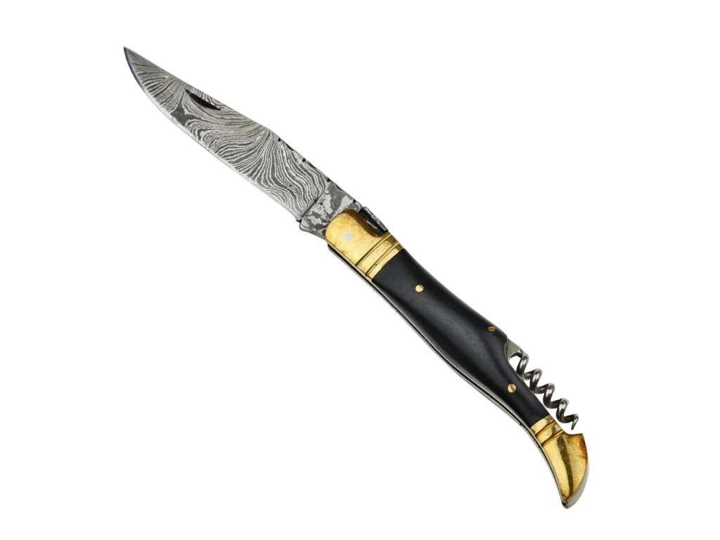 DAMAŠKOVÝ ZATVÁRACÍ NÔŽ "DON CORLEONE" V oblastiach mierneho pásu sa už od pradávna pestuje rastlina, ktorá sa využíva kvôli svojim chutným plodom. Vínna réva je rastlina, vďaka ktorej máme vína, oleje a rôzne pochúťky. A práve víno je jeden z dôvodov, prečo sa táto rastlina teší takej priazni človeka. Tisícročia pokusov, práce a rozvoja tejto rastline dali mnoho rôznych podôb. Keď sa už konečne dostane fľaša vínneho moku na Váš stôl, príde čas na otvorenie fľaše ak tomu je predsa potrebná vývrtka. Nemajte však obavy náš tím sa rozhodol, že pre Vás získa nôž, s ktorým si nielen otvoríte víno, ale prikrojíte si kúsok syra, alebo aj bagetu. Damasková čepeľ noža "DON CORLEONE" je vyrobená z kvalitnej damaskovej ocele. Damašková oceľ je utváraná z ocelí 1095 a 15n20. Jednotlivé vrstvy sa vzájomne prekladajú – bolo použitých 192 vrstiev! Jedine tak vzniknú unikátne vlastnosti damaskovej ocele a jej nádherný vzor. Tvrdosť damaskovej čepele sa pohybuje medzi nádhernými 58-60 Hrc! Dostane sa Vám teda do rúk nielen umelecký kúsok, ale aj kvalitná tvrdá oceľ. Všetky naše damaškové nože sú vyrábané výhradne ručne! Handmade 100%! Damasková čepeľ noža "DON CORLEONE" je elegantná čepeľou, ktorá Vás nadchne vďaka svojej dĺžke 9 cm, čo z nej robí ideálnu čepeľ na každodenné použitie. Vďaka svojmu klasickému tvaru zvládne všetky úkony, ktoré od zatváracieho noža očakávate. Od ukrojenia krajce chleba po ľahké pracovné úkony ako je vyrezávanie alebo odsekanie drobných vetvičiek. Čepeľ noža je brúsená v dutom výbruse, takže sa s Vašou novou čepeľou dokonca dá holiť! :)Rukoväť tohto noža "DON CORLEONE" je skutočným umeleckým dielom. Telo rukoväte je z kvalitnej ocele, na ktorej je ako prvá vrstva príložiek uchytená mosadz. Ako finálna vrstva príložiek je použitá leštená oceľ spoločne s čierno moreným drevom, ktorá je z oboch strán ohraničená zakončeniami z leštenej. Súčasťou rukoväte je aj vývrtka na otváranie korkových zátok, predovšetkým na víno. Celá rukoväť je potom spevnená mosadznými nitmi, ktoré vystužujú celú konštrukciu. Samozrejmosťou je, že každý pútnik potrebuje mať kde zložiť hlavu. Rovnako tak aj tento nôž má svoje vlastné ručne vyrobené puzdro z pravej hovädzej kože. Súčasťou púzdra je brúsik, vďaka ktorému nôž môžete priebežne pri práci doostrovať.Dodatočné parametre