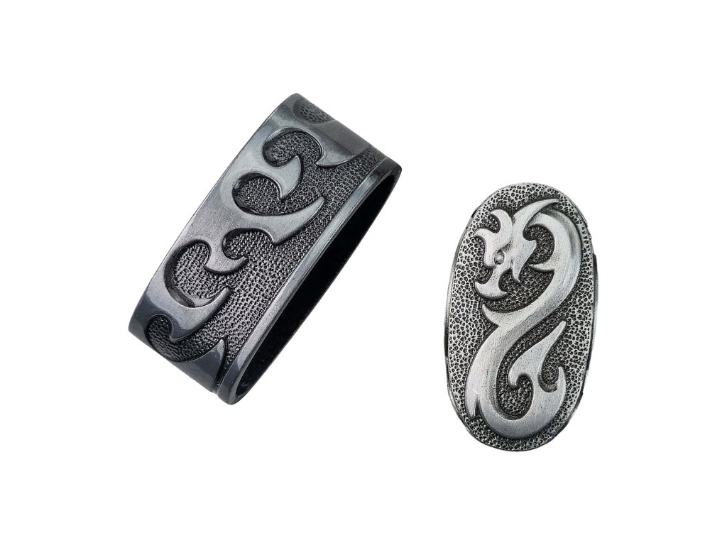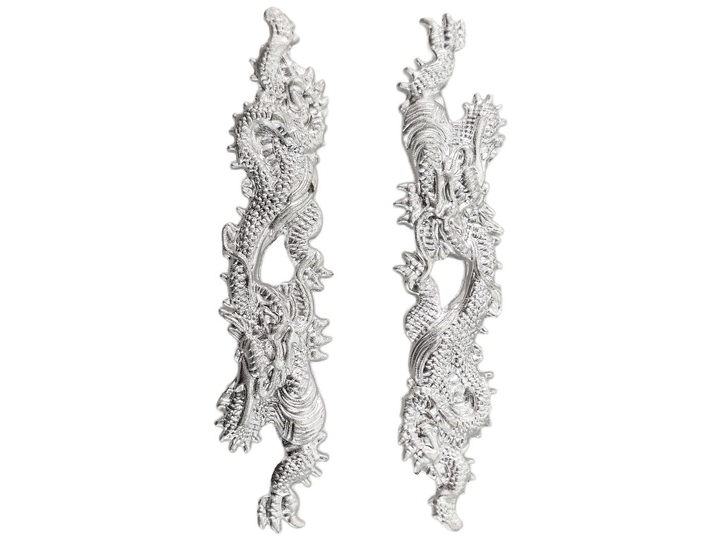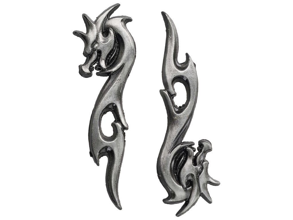 Obe varianty sa líšia predovšetkým motívom – čierna verzia pôsobí viac mýtickým, ostro rezaným dojmom, zatiaľ čo strieborná verzia ponúka robustný moderný vzhľad s bohatým dračím reliéfom. Každá sada je ľahká, nádherne spracovaná a pripravená na použitie alebo vystavenie.
