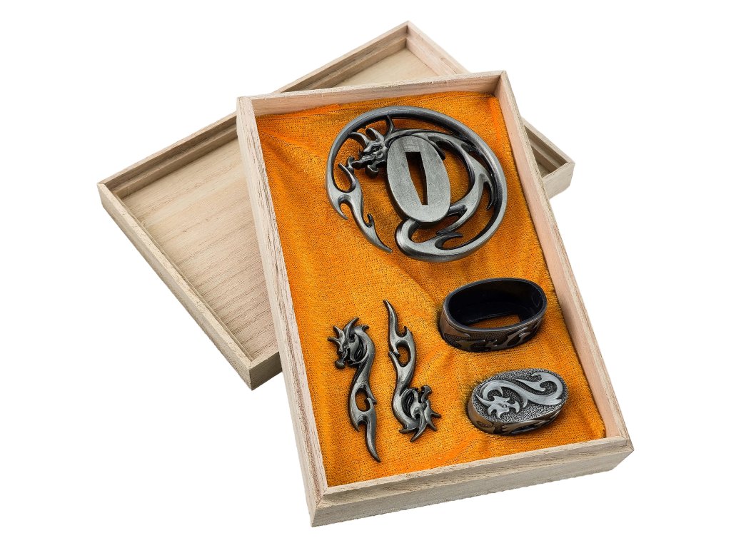 Súprava „DRAGON ORNAMENTS“ ponúka výrazné a prepracované doplnky pre každého, kto si chce upraviť alebo oživiť vzhľad svojich katán. Oba dostupné motívy využívajú dynamické dračie linky a reliéfne detaily, ktoré krásne vystupujú na kovovom povrchu a dodávajú meču osobitý štýl. Drevo krabičky spolu s jemnou textíliou vo vnútri zvyšujú pocit luxusu a robia zo sady skvelé darčekové balenie.
