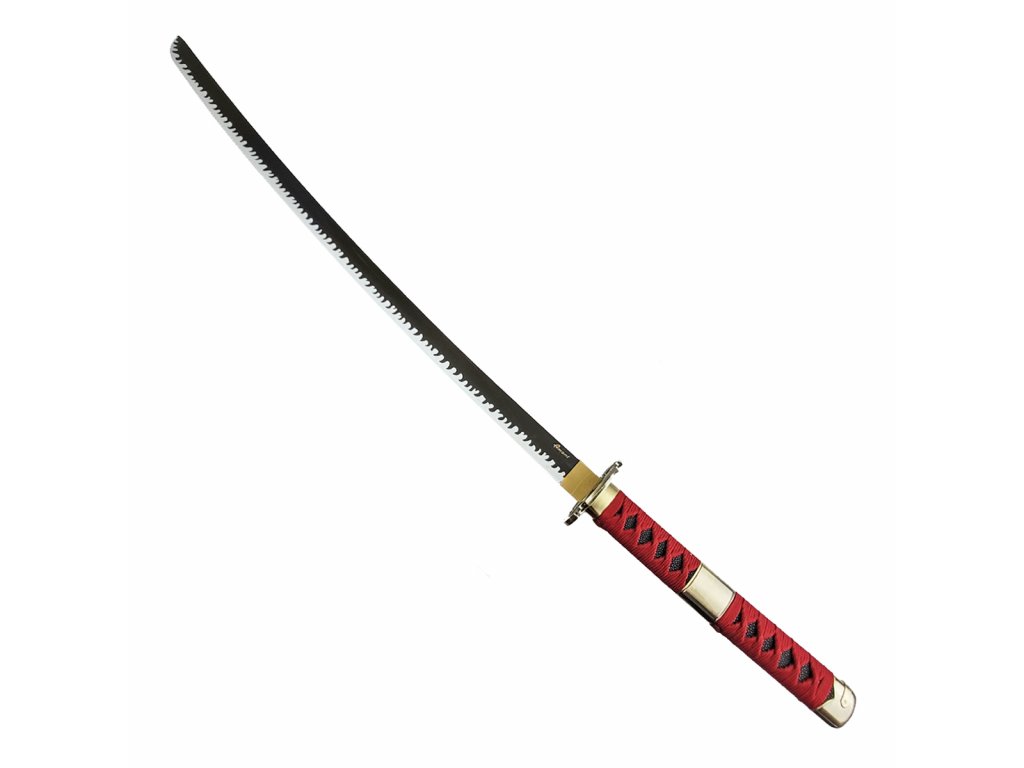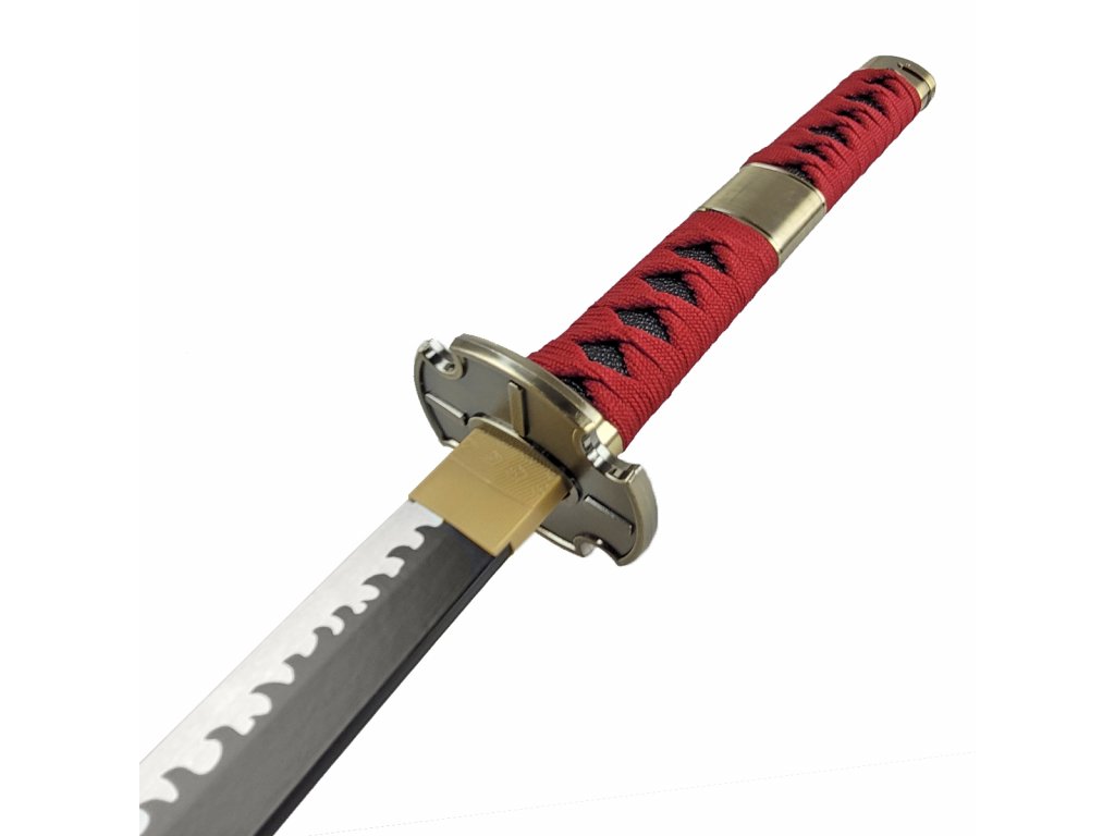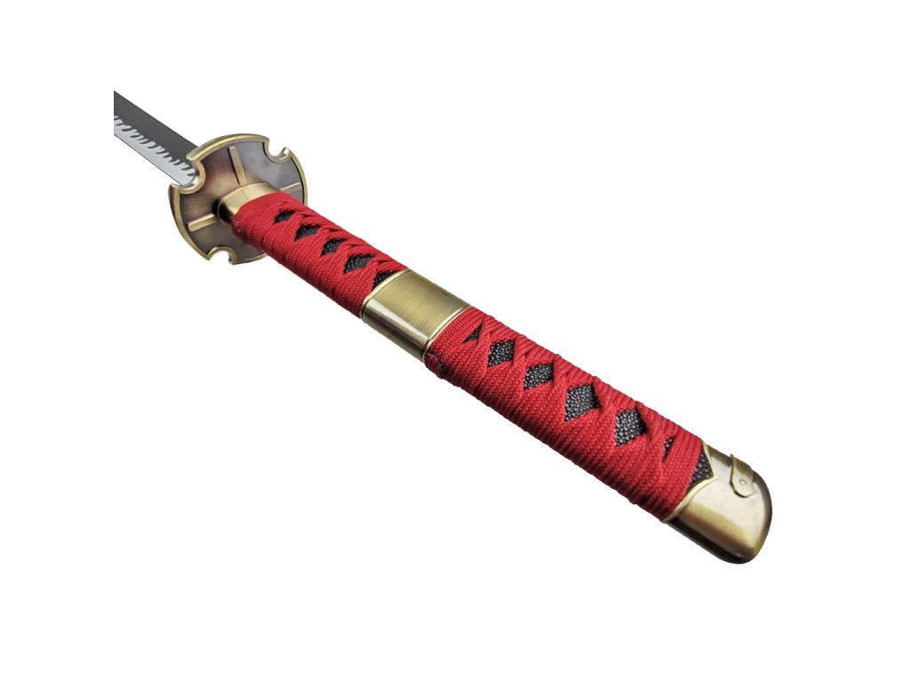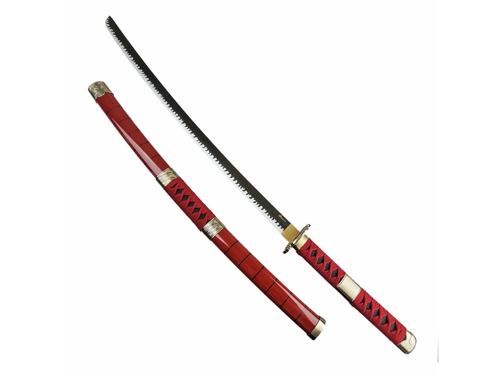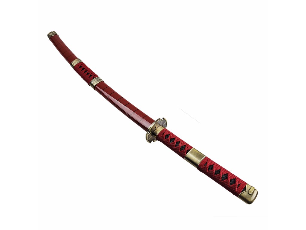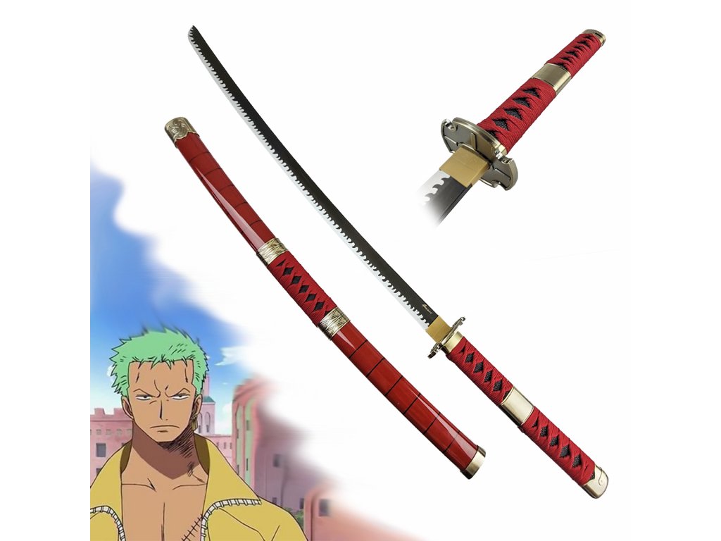 Drevená katana "SANDAI KITETSU" One Piece Ďalšia drevená verzia katany legendárneho lovca pirátov Roronoa Zora, ktorej predchodcu sme už mali skladom. Drevená katana SANDAI KITETSU" je svojim dizajnom 1:1 podobná svojej originálnej predlohe. Čepeľ katany o dĺžke 68 cm. je vyrobená z pevného dreva. Meč je teda určený prevažne ako výstavný kus alebo doplnok ku cosplayi. Avšak meč môžete tiež užiť na tréning do priestoru. Tsuba (záštita), je vyvedená presne podľa svojej anime predlohy. Rukoväť je omotaná červenou bavlnenou omotávkou, presne tak ako podľa originálu má byť. Pod ňou sa nachádza gumová kópia rajskej kože v čiernej farbe. Omotávka je na dotyk príjemná, pretože sa jedná o mäkkú bavlnu. Rukoväť je zakončená jednoduchou kashirou (hlavica na konci rukoväte). Súčasťou meče je aj drevená pošva v červenej farbe s podobným opletom, aký nájdeme na rukoväti. Katana Roronoa Zora „SANDAI KITETSU“ je ideálnym kúsok do zbierky fanúšika anime One Piece. Skvele ozdobí Vašu izbičku, spálňu alebo sa môže stať krásnym doplnkom k vášmu cosplayi. Tak chopte sa meče a hor sa na cestu za dobrodružstvom!!! "Ten meč je prekliaty pane! Nemôžem Vám ho predať!" Katana, ktorá sa ukrývala medzi lacnými mečmi a ktorej kvalitu vycítil člen Slamákovej posádky Roronoa Zoro. Išlo o dobrý meč, lenže prekliaty. Majiteľ ho Zorovi predať nechcel, a to zo strachu z onej kliatby. Zoro sa však nebál a rozhodol sa pokúšať šťastie tým, že bol ochotný obetovať svoju ruku. Kliatba sa však neprejavila a Roronoa Zoro sa stal majiteľom "SANDAI KITETSU"!Dodatočné parametre