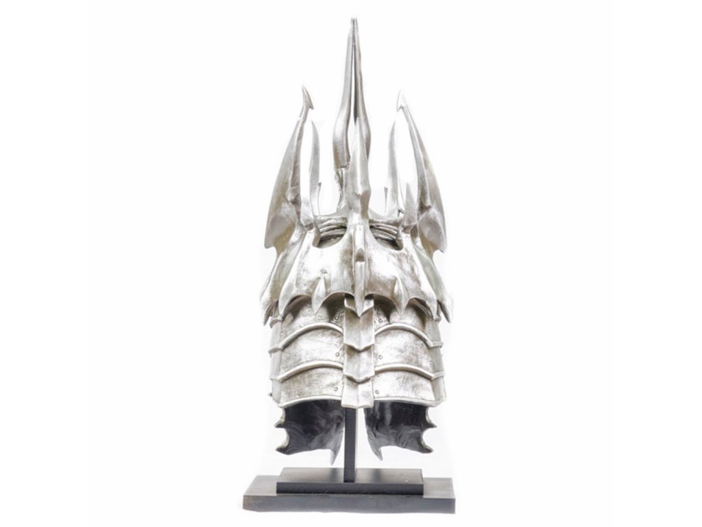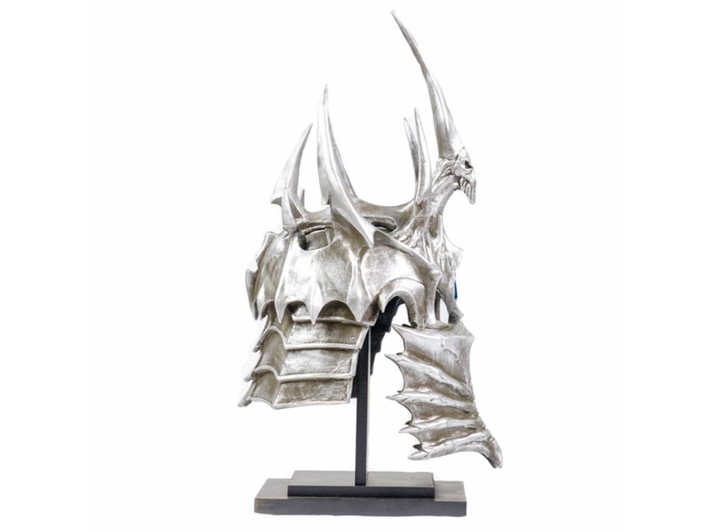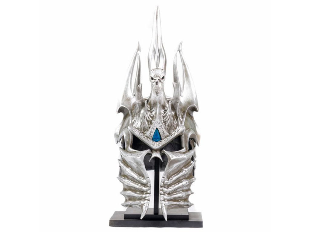 "Bez rozkazov ich pána, neúnavná pohroma sa stane ešte väčšou hrozbou pre tento svet. Trón musí byť obsadený. ??Vždy tu musí byť Lich King." Toto sú posledné slová ducha Therenasa, otca doterajšieho Kráľa Lichov, ktorý týmto odovzdal poslednú radu na tomto svete Paladinovi Tirione Fordringovi. Táto helma dáva jej nositeľovi moc nad celou pohromou. Ale za akú cenu? Dokážete túto moc ustáť aj Vy ?! Lich Kingova Helma "HELM OF DOMINATION" je jedinečným kúskom, ktorý nesmie chýbať v žiadnej zbierke fanúšika sveta Warcraftu a pre milovníkov expanzie Wrath of The Lich King je to úplná nutnost. Táto verná replika helmy Kráľa Lichov je celá vyrobená z odolnej živice (Polyresin) a vďaka tomu helma poskytuje dostatočnú pevnosť a odolnosť. Helma ako taká je však určená ako výstavná alebo cosplayová záležitosť, ktorá sa nehodí do víru bitky. No aj tak sa jedná o klenot Vašej zbierky, ktorý je určený pre ozdobu a divadelné účely. Ako už bolo povedané, "HELM OF DOMINATION" je nielen šperkom do vitríny, ale je tiež plne nositelná. Helma padne každému, ktorý má maximálny obvod hlavy do 58 cm. Plnohodnotne ju tak môžete nosiť ako šperk Vášho kostýmu. Samotné vyhotovenie "HELM OF DOMINATION" je práve tým dôvodom, ktorý z nej robí klenot. Helma je celá vyrobená zo živice, vďaka čomu je zaistená nielen kvalita, ale predovšetkým neuveriteľný dôraz na detail. Aj keď sa jedná o detaily všetkého profilovania prilby a ozdôb v štýle bodcov a lebky v popredí alebo o krásne vykonanom runovom písme v oblasti očníc. Celému tomuto zdobnému prevedeniu potom na čele dominuje azúrovo modrý kryštál. Súčasťou spolu s touto detailnou helmou "HELM OF DOMINATION" je krásny masívny stojan, vďaka ktorému si túto luxusnú helmu môžete vystaviť kamkoľvek vo Vašom obydlí, a vo chvíľach kedy tento skvost nenosíte na hlave Vás tak môže tešiť ako jedinečný kúsok výzdoby.