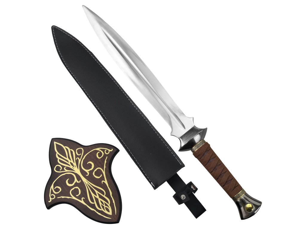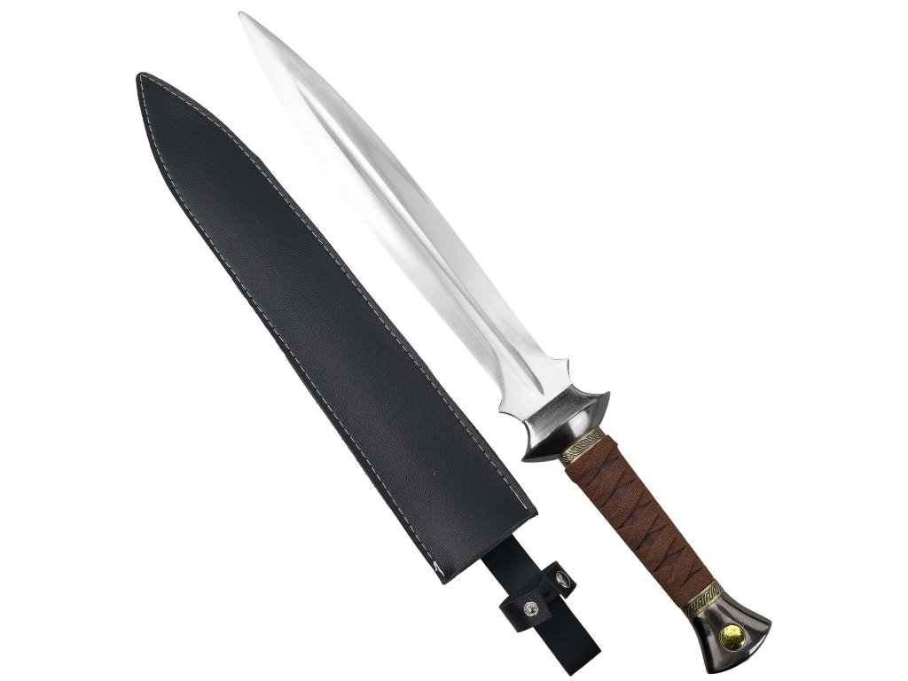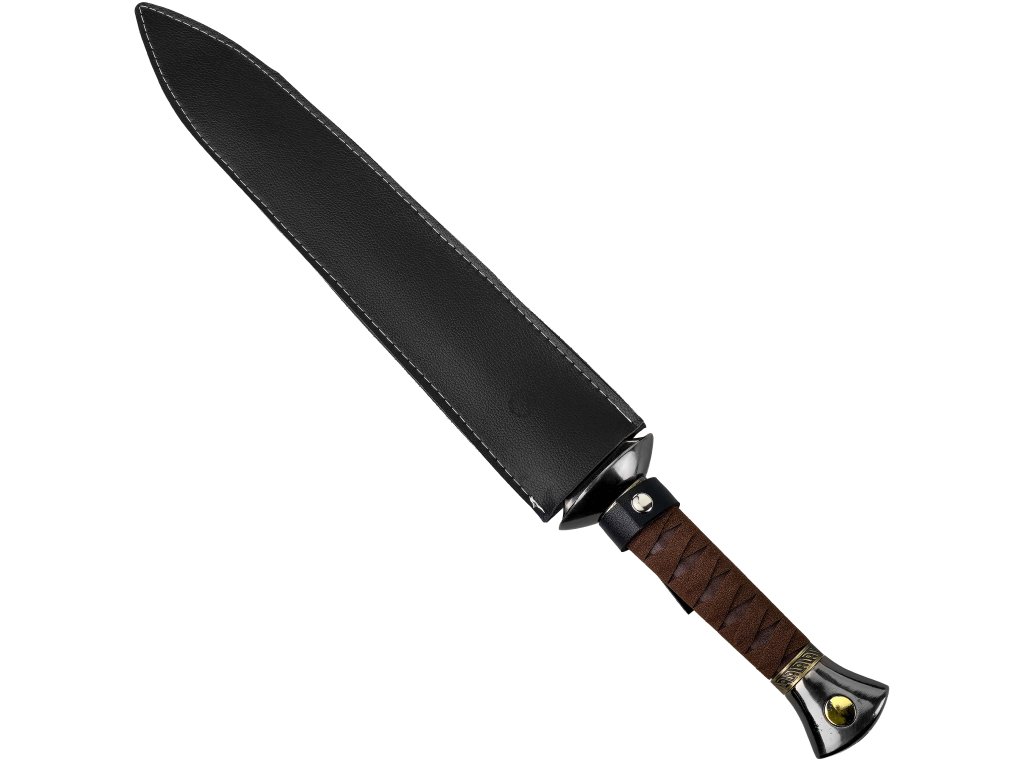 Čepeľ z leštenej nerezovej ocele má výrazné žliabkovanie pre ľahkosť a pevnosť, zatiaľ čo rukoväť z dreva je obalená kvalitnou eko-kožou pre istý a pohodlný úchop. Záštita aj hlavice sú kovové s antickým vzhľadom, čo dodáva zbrani realistický a filmový charakter. Celý meč pôsobí vyvážene, elegantne a vďaka dĺžke necelých 60 cm sa hodí ako zberateľský kus aj dekorácia.