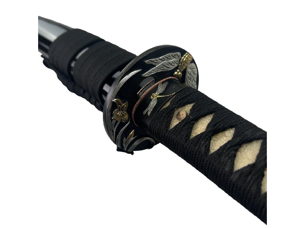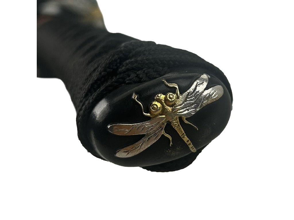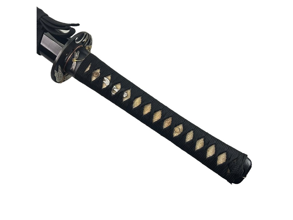 Rukoväť je tvorená tvrdým drevom, potiahnutým rajou kožou a čiernym opletom, ktorý zaisťuje pevný a komfortný úchop. Detaily meča – kashira, tsuba aj tsuka – sú precízne zdobené motívmi vážok, ktoré dodávajú katany jedinečný vzhľad a hlbší symbolický význam.