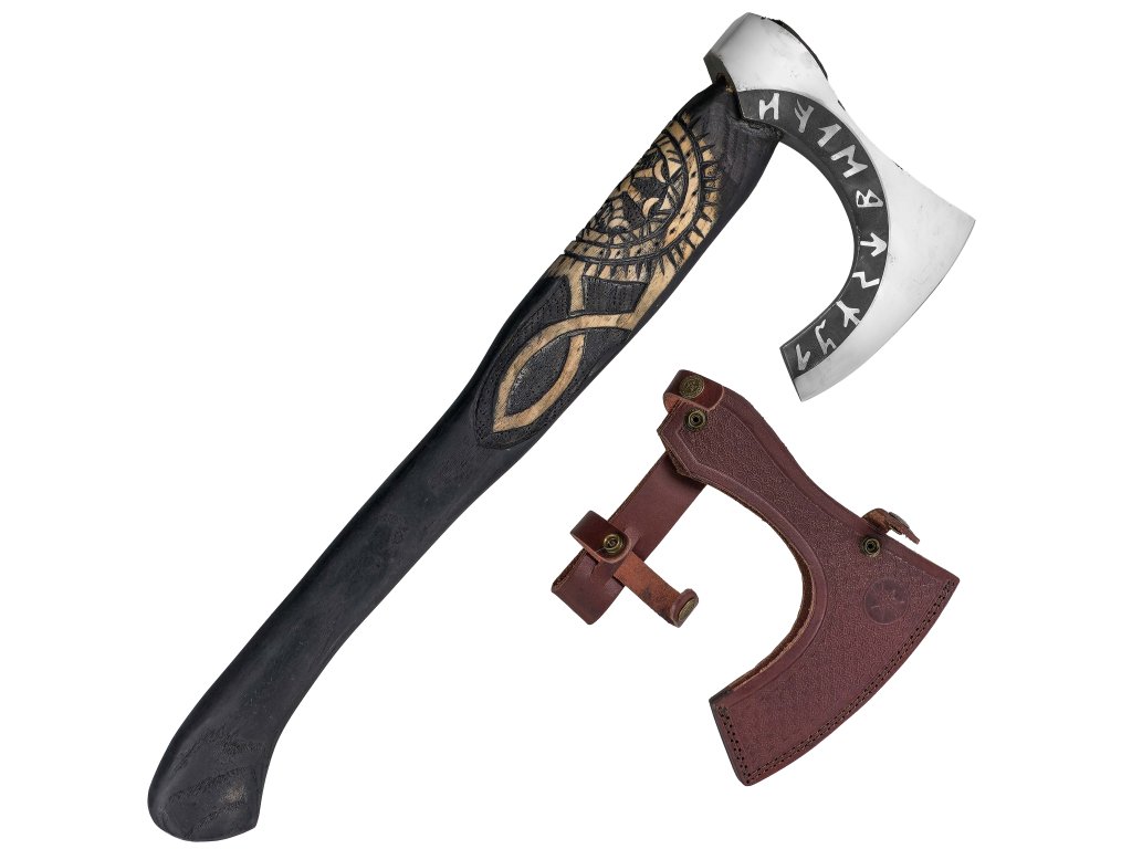 Hlavica je vyrobená z uhlíkovej ocele, ktorá poskytuje pevnosť a odolnosť pri zachovaní nízkej váhy. Jej tvar s otvoreným prierezom dodáva sekere originálny vzhľad a symbolický nádych runového štýlu. Ostrie je jemne brúsené – vhodné na ľahké údery a drobné úpravy, nie však na ťažké kosenie. Porisko z kvalitného dreva je černené a zdobené vypaľovanými motívmi, ktoré zvýrazňujú mystickú atmosféru tohto dizajnu.