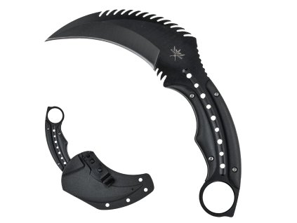 Karambit "CLAW OF T-REX" čierny (CS:GO edícia) Tento celočierny borec má všetko, čo má správny karambit mať, a ešte niečo naviac! Jedná sa o ďalšiu zbraň z Counter Strike: Global Offensive edícia, tentoraz oHunter Karambit! Z jeho veľkosti a temného dizajnu doslova prebieha mráz po chrbte, pretože pripomína pazúr mocného Tyranosaura! Vďaka temnej povahe karambitu ho už nebudete chcieť dať z ruky. Jeho zahnutá čepeľ z nerezovej ocele pôsobí démonsky zlovestne :-). Pevná čierna rukoväť je ergonomicky tvarovaná a zakončená očkom pre prst. Na vrchu rukoväte sa nachádza vrúbkované miesto pre lepšie držanie. To všetko pre ten najpohodlnejší a najistejší úchop! Karambit je dodávaný s pevným puzdrom na ochranu čepele a tiež Vášho vrecka. Čepeľ sa do puzdra hladko zacvakne, takže nehrozí vypadnutie karambitu. Na konci puzdra sa nachádza tkanina zavesenia. S karambitom "CLAW OF T-REX" sa budete cítiť ako samotný kráľ Jurského parku! ;-)Dodatočné parametre