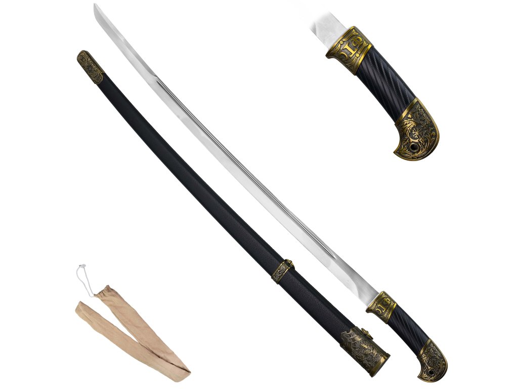 Rukoväť aj pošva sú zdobené detailnými kovovými ornamentmi s historickými motívmi, ktoré dodávajú celej zbrani nádych luxusu. Čierna drevená pošva je vystužená kovovými prvkami v bronzovej farbe, ktorá perfektne ladí s rukoväťou. Súčasťou balenia je aj látkový háv na bezpečné uskladnenie a ochranu proti prachu.