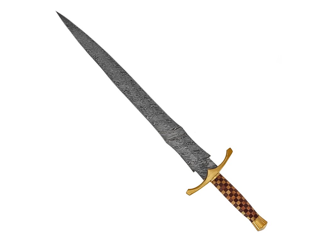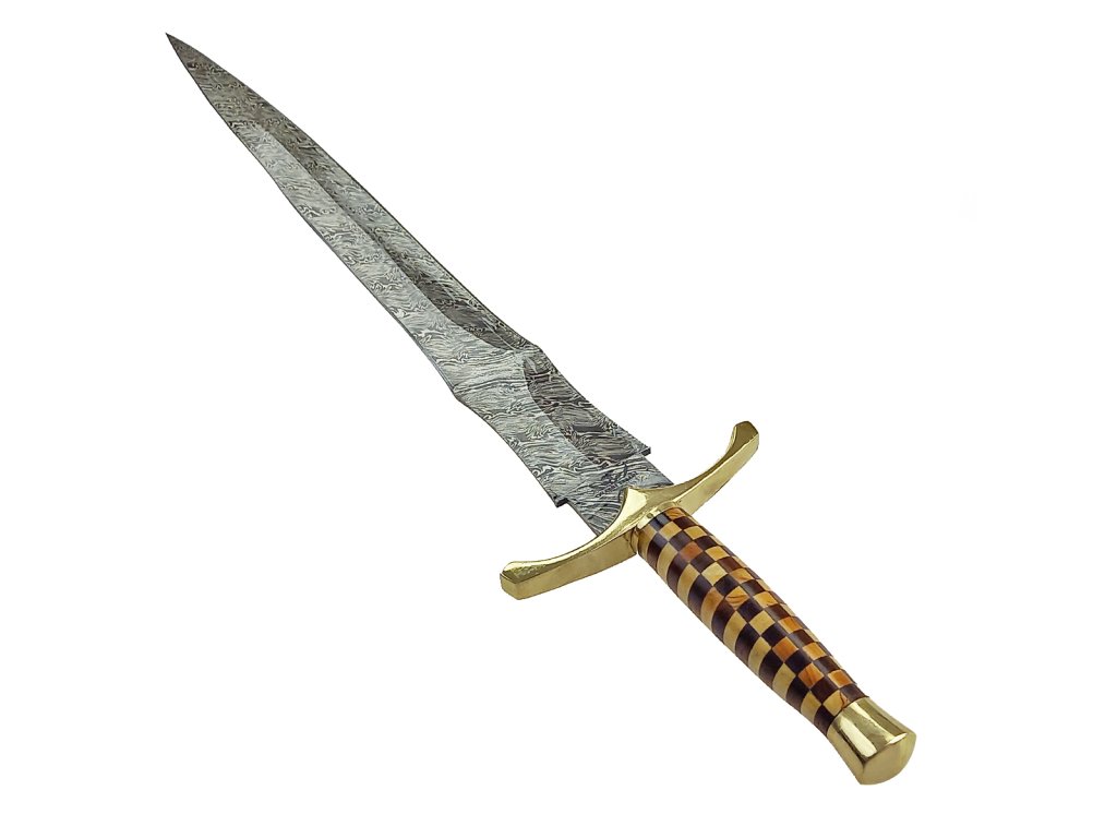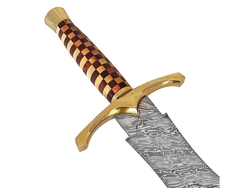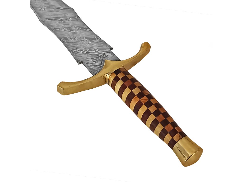 KRÁTKY DAMAŠKOVÝ MEČ "JOAN OF ARK" FUNKČNÝ, OSTRÝ! Nádherný meč ktorý bol ručne vykovaný v našich kováčskych dielňach na blízkom východe. Kus s ktorým môžete cestovať časom a vrátiť sa do čias 100-ročnej vojny, kedy sa odohral príbeh legendárnej Panny Orleánskej. Novinka na našom e-shope, ktorá očarí nejedného fanúšika rytierstva. Meč vyrobený v kombinácii modernej damaskovej ocele, mosadze a dreva. S hrdosťou Vám predstavujeme brata meča "SIR LANCELOT", Krátky damaškový meč "JOAN OF ARK"! Obojočnú čepeľ pokrýva od špičky k záštite damaškový povrch, meria po celej svojej dĺžke 61,5 cm. Uprostred čepele nájdeme stredový chrbát, ktorý sa tiahne takmer po celej ploche. Hrúbka tupej časti čepele pod záštitou meria 4 mm. Ostrie je už z výroby ostrené. Čepeľ je zapustená do rukoväte a vďaka čomu je dostatočne spevnená, meč teda vydrží kosenie aj tvrdších materiálov, avšak z dôvodu ostrosti čepele meč neodporúčame užívať na kontaktný šerm. Zdobná rukoväť oblého tvaru meria od hrušky po záštite 15,8 cm. Vďaka svojmu tvaru pohodlne sadne do ruky. Okolo oceľového jadra sa nachádza drevený povrch, ktorý je leskle lakovaný a zdobený štvorcovým vzorom. Drevený povrch je leskle lakovaný. Zahnutá záštita a hruška na konci rukoväte sú vyrobené z leštenej mosadze. K meču "JOAN OF ARK" získate aj puzdro z hovädzej kože. Toto puzdro je vyrobené presne na mieru a meč doňho nádherne zapadne. Vďaka pevnému oku si ho môžete bezpečne zavesiť na opasok a nosiť ho ako pravý šľachtic. :) Na puzdre sa tiež nachádza remienok s cvočkom, ktorý slúži ako poistka proti samovoľnému vykĺznutiu meča. Krátky damaškový meč "JOAN OF ARK" je skvelým darčekom pre milovníkov histórie. Dokonale sa bude vynímať nad vašim krbom alebo pod pergolou. Je možné ho tiež využiť na nácvik šermu, kosiť s ním mäkšie, ale aj niektoré tvrdšie materiály. Napr. drevené vetvy, PET fľaše, konzervy, tvrdšia zelenina (napr. kaleráb, repa atď.).Dodatočné parametre