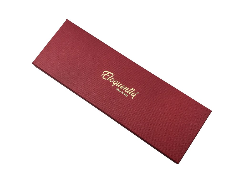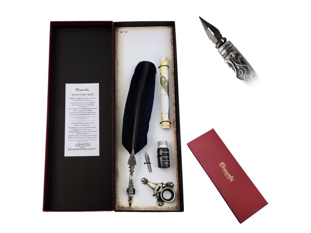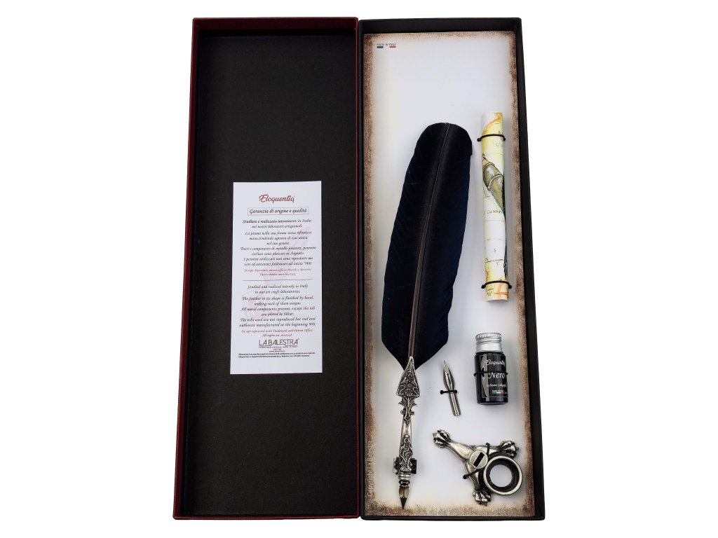 Súčasťou sady je všetko, čo potrebujete pre autentický zážitok z písania: náhradný kovový hrot, fľaštička s atramentom, stojanček na brko a dekoratívny kus pergamenu. To všetko je uložené v elegantnej darčekovej krabičke s logom Eloquentia, takže sada pôsobí veľmi reprezentatívne a je vhodná aj ako hodnotný darček.