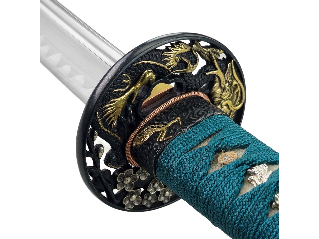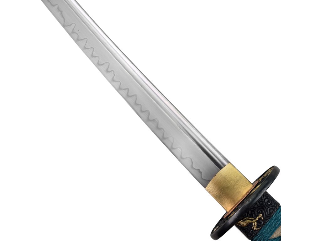 Čepeľ (nagasa) je vyrobená z ocele T10, kalené ílom pre tvrdosť až 60 HRC. Vďaka tomu je na ostrie výrazný autentický hamon, vzniknutý tradičnou metódou diferenciálneho kalenia. Rukoväť (tsuka) je potiahnutá pravou rajou kožou (samegawa) a opletená pevným bavlneným opletom (ito) v odtieni tmavej zelene.