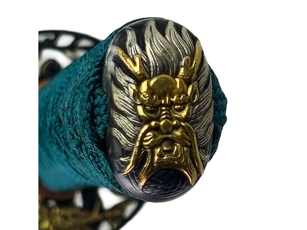 Katana je ďalej vybavená oceľovou, nádherne zdobenou záštitou (tsuba), ktorá zobrazuje prepracované motívy inšpirované japonskou históriou. Pošva (saya) v žiarivej červenej farbe s dopĺňa celkový dojem luxusu a ručného remesla. Každý detail – od koiguchi až po kashiru (hlavicu rukoväte) – pôsobí precízne a harmonicky.