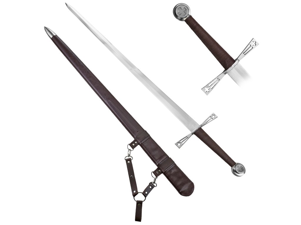 Obyčajná krútivá kovová záštita a hruškovitá hlavica zaisťujú vynikajúce vyváženie meča. Rukoväť je potiahnutá pravou kožou pre pevný a pohodlný úchop aj pri dlhšom používaní. Súčasťou balenia je drevená pošva potiahnutá pravou kožou, doplnená o popruh umožňujúci nosenie cez rameno alebo na opasku - funkčný a elegantný doplnok v jednom.