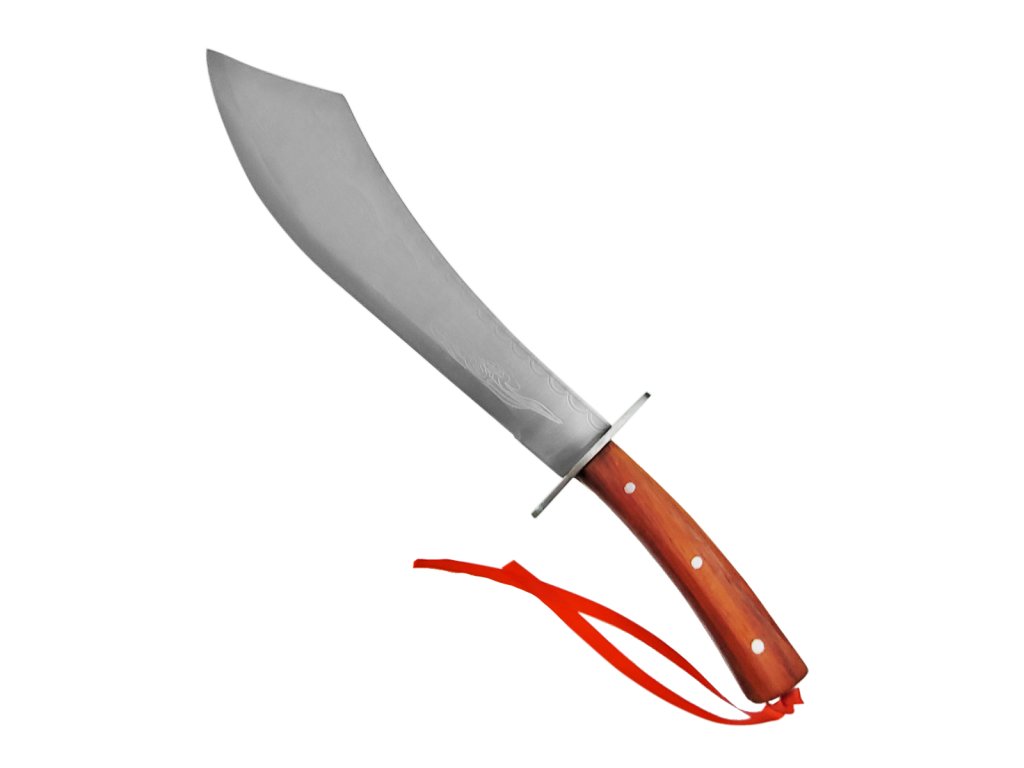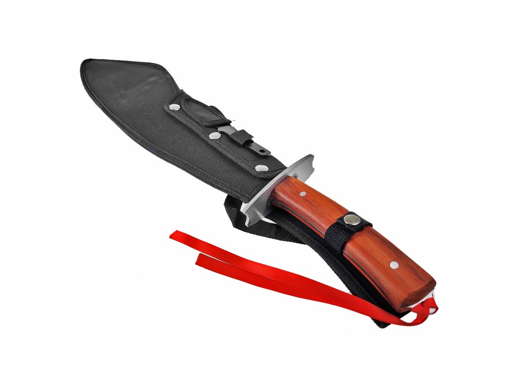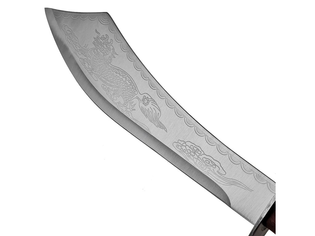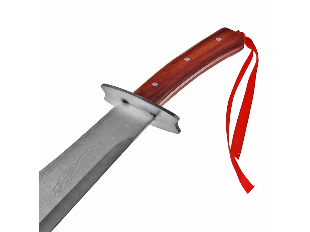 Veľkolepá mačeta šavbľovitého tvaru s drevenou rukoväťou a kovovou záštitou, ktorá Vám bez problémov nahradí meč, sekerku a mačetu !!! Mačeta "SHAOLIN DRAGON" dlhá 64 cm je veľmi vydarene zdobená motívom čínskeho draka z oboch strán byteľnej čepele, ktorá je navyše poriadne ostrá! :-) Svojou hmotnosťou neuveriteľných 950 gramov a posunutým ťažiskom sa z mačety "SHAOLIN DRAGON" stáva obor, hladný po práci. Bez zábran sa púšťa do dreva a pokiaľ je dobre vedený, úspešne porciuje a seká ako o život! Čepeľ mačety "SHAOLIN DRAGON" je pretiahnutá skrz celú rukoväť, kde je spevnená hneď 3 kovovými nitmi! Na konci rukoväte je kovová pätka s otvorom pre padákovú šnúru alebo inú taktickú tkaninu, ktorú si môžete prievlekom pripevniť. (Taktická tkanina nie je súčasťou balenia) Rukoväť mačety "SHAOLIN DRAGON" je z pravého tvrdého dreva a je zakončená kovovou záštitou. Môžete ju držať aj dvoma rukami - mačeta je dostatočne dlhá! Mačetu Vám dodáme aj s nylonovým puzdrom ako darček! S mačetou "SHAOLIN DRAGON" získate aj úplne funkčný vrhací nôž! Vrhací nôž je vyrobený z nerezovej ocele a nachádza sa v malej kapsičke na puzdre.