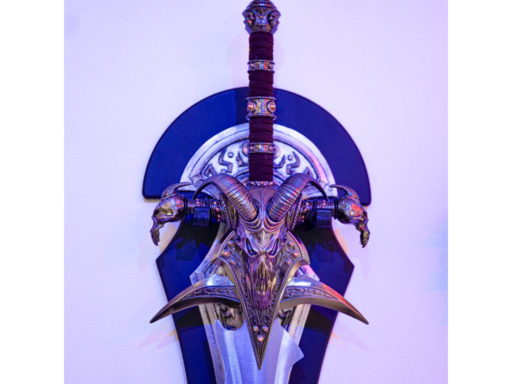 Ešte predtým, ako začala vojna na Azerothe, spútali démoni plamennej légie moc a s ňou i dušu Ner'zhula do zbroje ale predovšetkým do zbrane kráľa Licha. Zbroj i meč potom ukryli na Azeroth do miesta zvaného Ľadový trón v Northrendu. Tu sa tiež tejto čepeľi zmocnil Arthas Menethil. Princ Lordareonu, ktorý do tejto pustatiny prenasledoval démona Mal'Ganise, aby sa pomstil za útrapy, ktoré spáchal jeho ľudu. Prekliaty Mrazivý smútok ho však pohltil a Ner'zhul získal vládu nad mladým princom. Nový kráľ Lichov povstal. S radosťou Vám predstavujeme zbrusu nový "FROSTMOURNE". Odoláte volaniu Ner'zhula ?! :) Replika "FROSTMOURNE" je vysoko kvalitnou a detailnou replikou v každom smere. Jedná s o kovové spracovanie vo veľkosti 1: 1 s úplne dokonalými detailmi. Čepeľ tohto meča je dokonalou kópiou meča "FROSTMOURNE" v celej svojej kráse. Masívna čepeľ je vyrobená z kvalitnej nehrdzavejúcej ocele, vďaka ktorej sa o údržbu absolútne nemusíte starať. Na čepeli je nádherne vytiahnuté ostrie, avšak čepeľ je kvôli bezpečnosti pri manipulácii tupá. Čepeľ je ďalej zdobená runovým písmom rovnako ako originál. Záštita meča "FROSTMOURNE" je skutočným umením. Dôraz je tu kladený na každučký najmenší detail, ktorý nájdete na originálnej čepeli. Celá sekcia je vyrobená z nerezovej ocele a opatrená čiernou patinou. Rukoväť je vyrobená z dreva, na ktorom je omotaná pravá koža. Rukoväť je potom zdobená 3 mi oceľovými kruhmi cez celú dĺžku. Hlavica je rovnako ako zvyšok meča vyrobená z nerezovej ocele, s absolútne dych vyrážajúcimi detaily.- dĺžka: 120 cm li>
