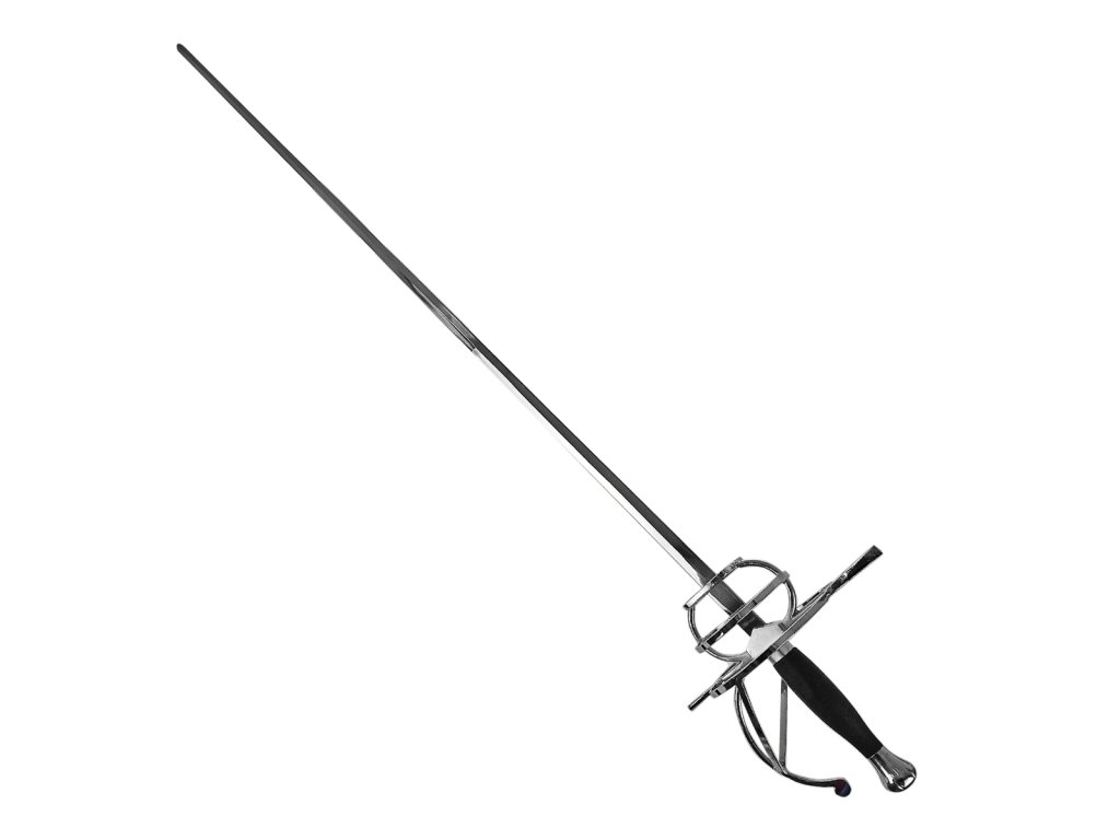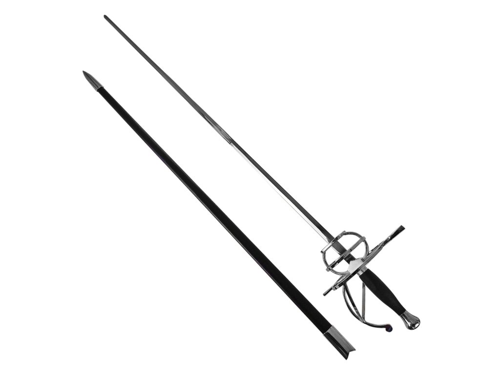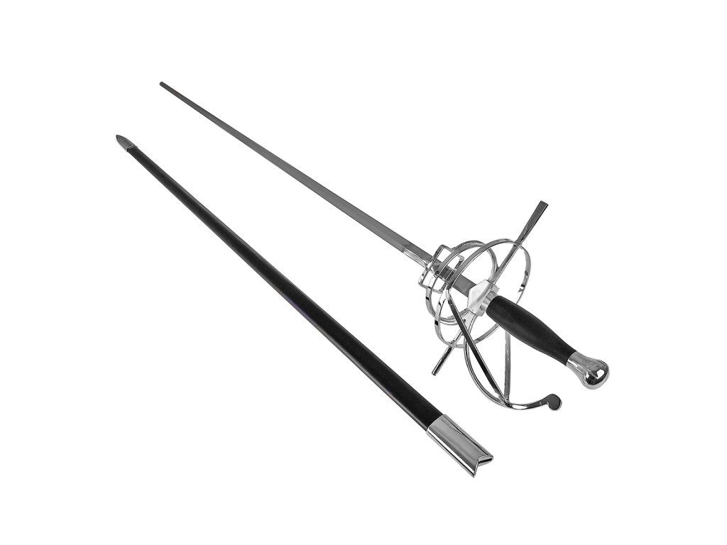 Reálne dlhý mušketiersky kord s bohatými košom! Mušketiersky kord "D'ARTHAGNAN" meria neuveriteľných 110,5 cm! Pružná ohybná čepeľ z nerezovej ocele je príjemne lesklá a v rukoväti spevnená. Rukoväť je chránená mohutným a veľkolepým košom, ktorý tak umožňuje správne držanie kordu a pravý mušketiersky šerm. Rukoväť kordu "D'ARTHAGNAN" Je čisto čierna, vyrobená z masívneho kusu kovu. Vďaka svojmu tvaru pohodlne sadne do ruky a nie je kĺzavá. Vďaka kvalitnému spracovaniu môže slúžiť tento kord nielen na dekoráciu, ale aj k možnému nácviku bezkontaktného šermu. Teoreticky by mohol poslúžiť aj pre mierny kontaktný šerm! Všetky detaily sú masívne a z kovu!