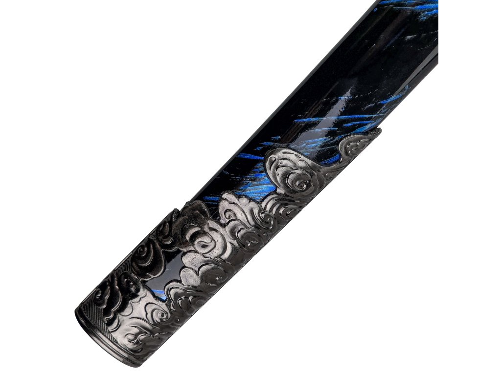 Čepel je vyrobena z uhlíkové oceli, není ostřená, ale je precizně leštěná. Rukojeť (tsuka) je dřevěná, obtočená tradiční bílou tkaninou (ito) s černými ozdobami samegawa. Kovová záštita tsuba je bohatě zdobená motivy blesků a větru, zatímco pochva saya je doplněna kovovým zakončením a pevným modrým sageo – šňůrou pro uchycení k obi (pásu). Každý detail byl vytvořen s důrazem na kvalitu a filmovou estetiku.