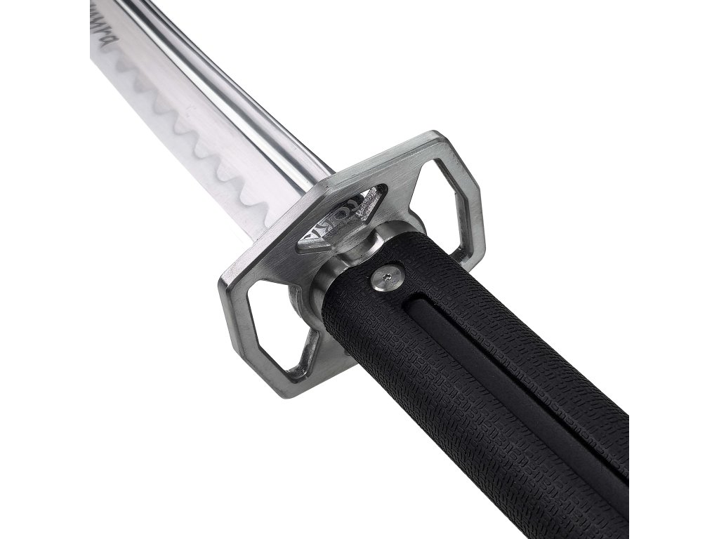 Rukoväť (tsuka) o dĺžke 28,5 cm je potiahnutá protišmykovou gumou pre bezpečný úchop aj v náročných podmienkach. Kovová záštita (tsuba) chráni ruku a zároveň dodáva meču estetický kontrast. Táto kombinácia funkčných a vizuálnych prvkov robí z wakizashi „YOKIMURA“ nástroj, ktorý ctí tradíciu samurajov aj potreby moderného užívateľa. Minimalistický dizajn podčiarkuje japonská čistota formy a premyslená ergonómia.