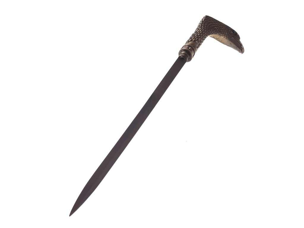 Krásne vykonaná vychádzková palica s čepeľou s hlavicou modrookého orla! Palica s čepeľou "AMERICAN EAGLE" meria ideálnych 91 cm! Iste ju oceníte, ako na ulici, tak na tematických podujatiach a zábavách, ako pôsobivý módny doplnok. To však nie je všetko! Po odskrutkovaní kovovej hlavice vytiahnete 31 cm dlhú čepeľ z nerezovej ocele! Čepeľ je otupená z dôvodov bezpečnosti, možno však nabrúsiť a používať v praxi ako originálnu skrytú zbraň! Palica s čepeľou "AMERICAN EAGLE" je vyrobená celá z kovu! Výnimkou je len gumový nástavec na konci palice, slúžiaci ako jej ochrana a navyše tlmí nárazy palice. Táto skrytá palica disponuje skvostnými kovovými detailmi, ktoré sa vynímajú svojou prepracovanosťou a nádherou!Dodatočné parametre