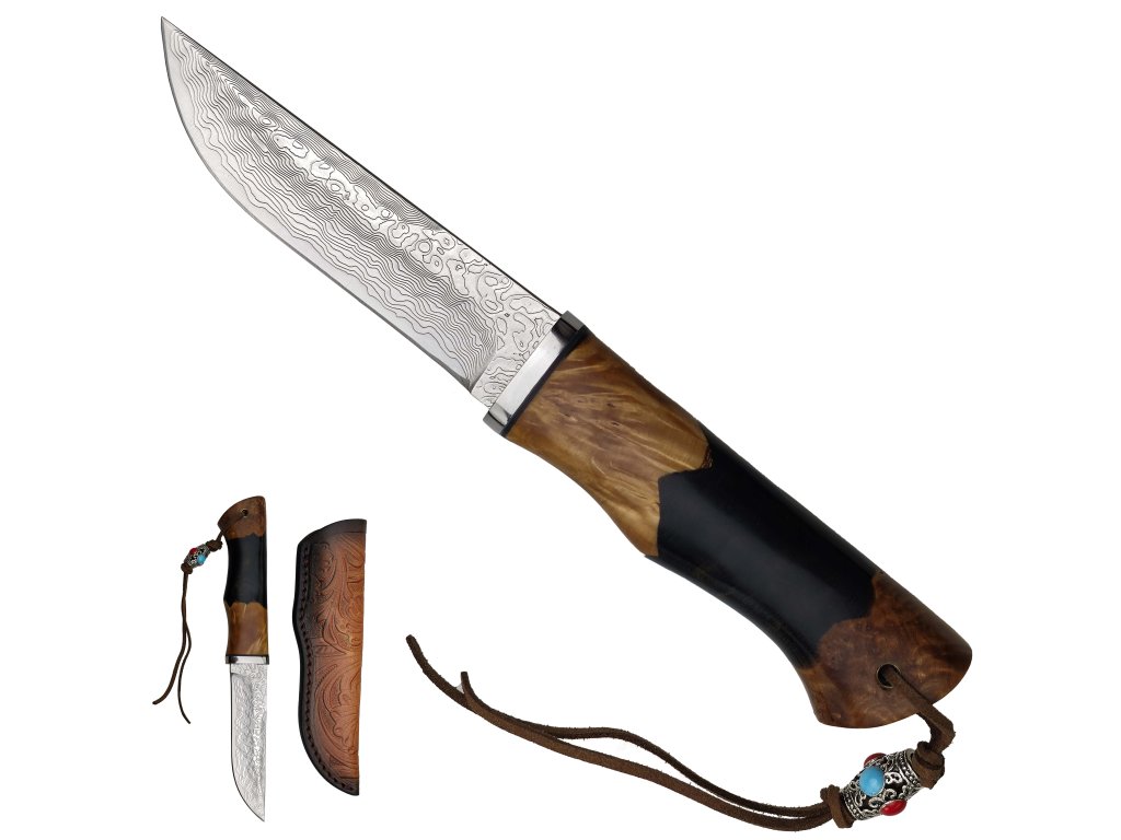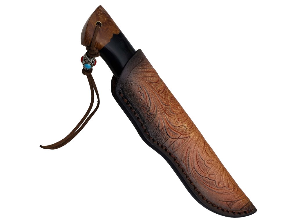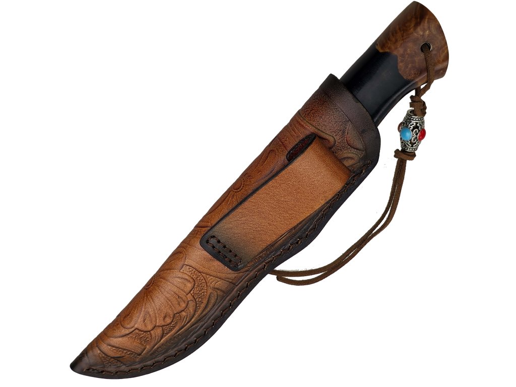 Rukoväť tohto noža je vyrobená spojením živice a orechového dreva, čo dodáva nožu elegantný a prirodzený vzhľad. Táto kombinácia materiálov tiež zaistí pohodlný úchop a pevnú kontrolu nad nožom počas používania. Aby bol Váš nôž dobre chránený, je dodávaný s ručne šitým koženým puzdrom, pri ktorom je možnosť ho pripevniť za opasok.