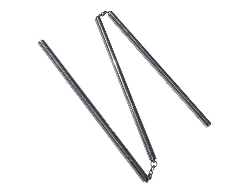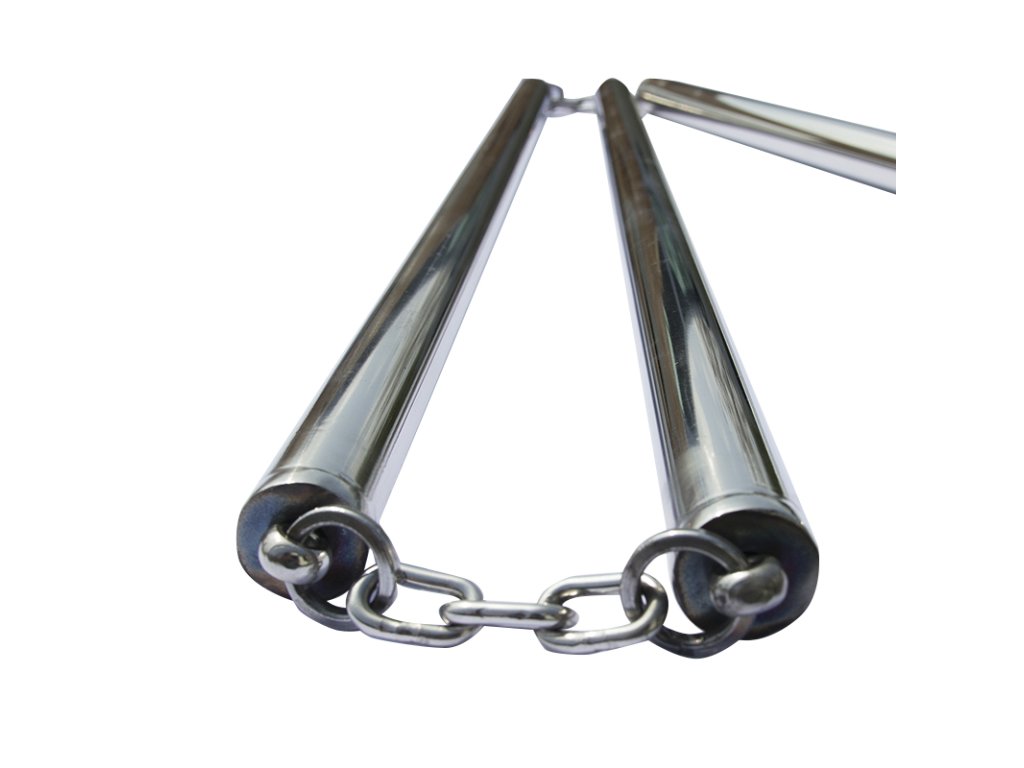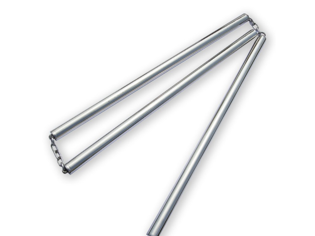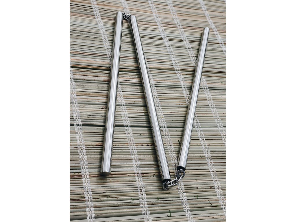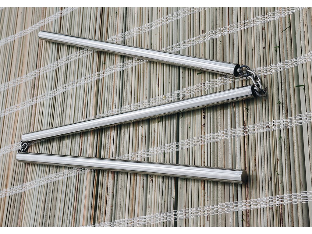 Čínsky "SANSETSUKON" čiže San ťie kun, je trojitá palica, respektíve trojité nunčaky! Podľa legendy vznikla zbraň priamo v šaolinskom chráme okolo roku 600, iné zdroje uvádzajú dátum vzniku až v roku 960 v období dynastie Song. Armádnemu generálovi Jun Hong Yahovi, expertovi na palice sa palica v boji zlomila a on ju spojil reťazou. Neskôr spojil tri palice, čím vznikol "SANSETSUKON". Táto zbraň bola nasadzovaná do armády, kde bola používaná na obranu voči oštepom a iným dlhým zbraniam. Na Okinawu priniesol trojitú palicu majster Matayoshi Shinko (1888-1947), ktorý sa naučil zaobchádzať s touto zbraňou počas svojej druhej návštevy Číny na začiatku 20. storočia. Veľkou výhodou bolo to, že "SANSETSUKON" dokázal udrieť "za roh", čiže dokázal trafiť protivníka ukrývajúceho sa za štít a pri rotačných technikách sa generovala obrovská sila, pričom sa mohla meniť dĺžka zbrane. Naše trojité nunčaky "SANSETSUKON" sú plne funkčné! Vyrobené sú celé z nerezovej ocele, spojené pevne oceľovými reťazami! Odolná konštrukcia a oceľový materiál zaisťuje efektívny trénink.S čínskou legendárnou zbraňou "SANSETSUKON" je radosť trénovať. Je možné cvičiť úplne jedinečné techniky na rozdiel od klasických nunčakov