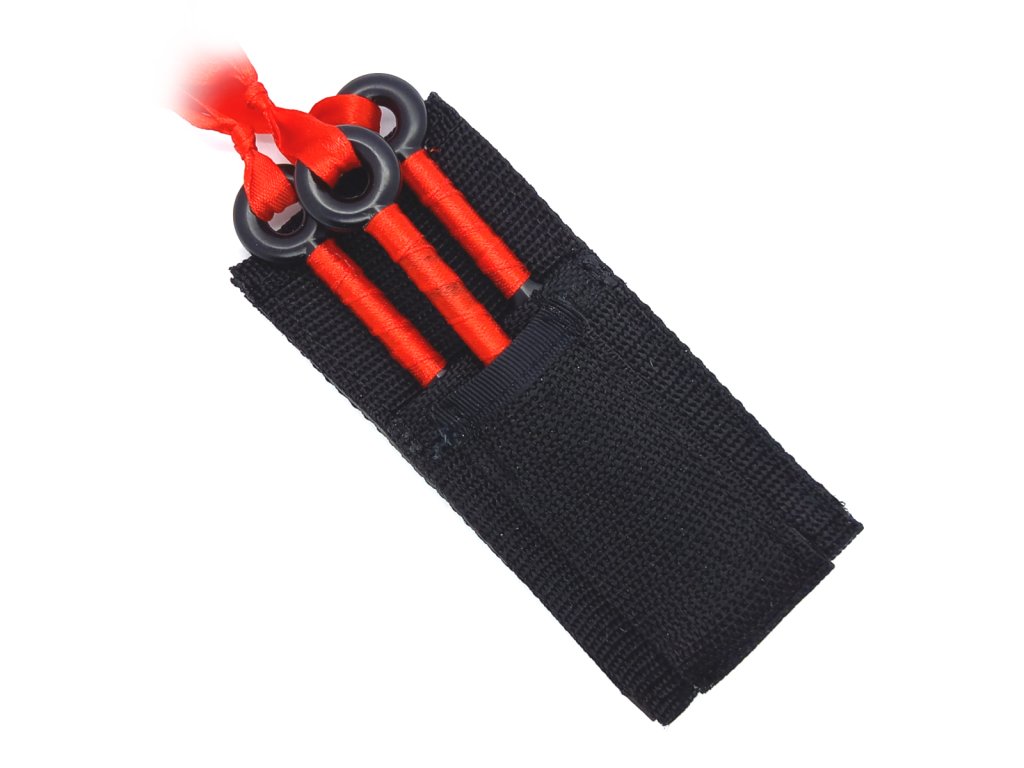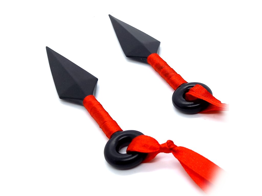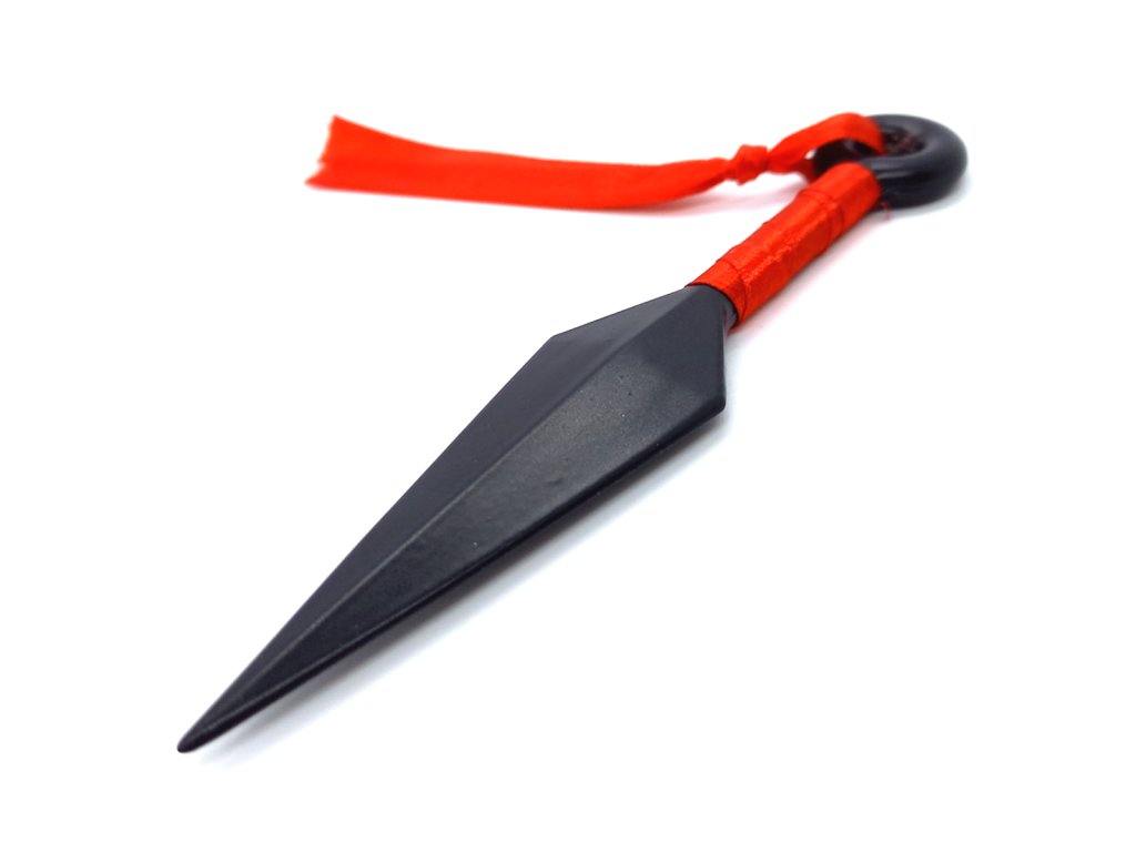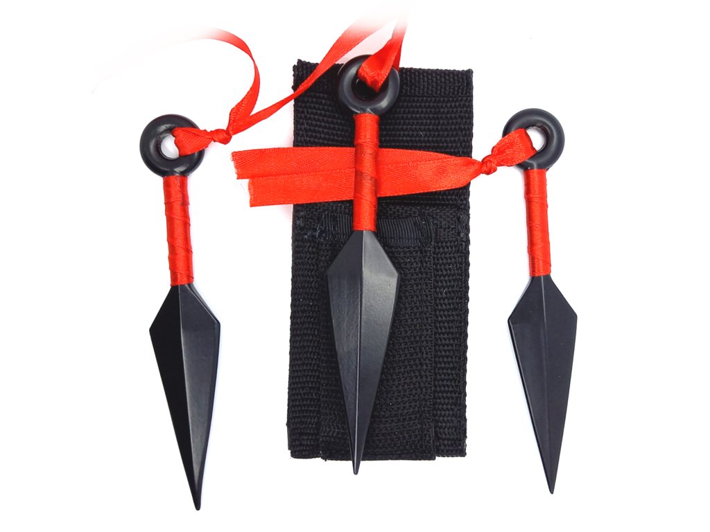 Vrhacie nože "TRIO KUNAI" Tri celočierne kovové vrhacie nože v jednoduchom puzdre opatrené červenou stuhou na rukoväti. Jedná sa o malé nože tvarom pripomínajúce šípku. Nože štýlu KUNAI pochádzajú zo starého Japonska a pôvodne sa skôr než o zbraň ninjov jednalo o hojne a rozmanito používaný remeselný nástroj. Opracovávalo sa s nimi drevo, tehly či kosti, ale aj kopalo a mali aj ďalšie využitie. Ninjovia potom využili rozšírenosť nástroja, ako maskovanie pre viacúčelovú zbraň v boji. Cieľom hodu týchto nožov by rozhodne nemala byť doska z tvrdého dreva či niečo také, zvoliť by ste mali skôr mäkšie materiály, aby sa čepeľ nepoškodila, ale zabodla do terča.Dodatočné parametre