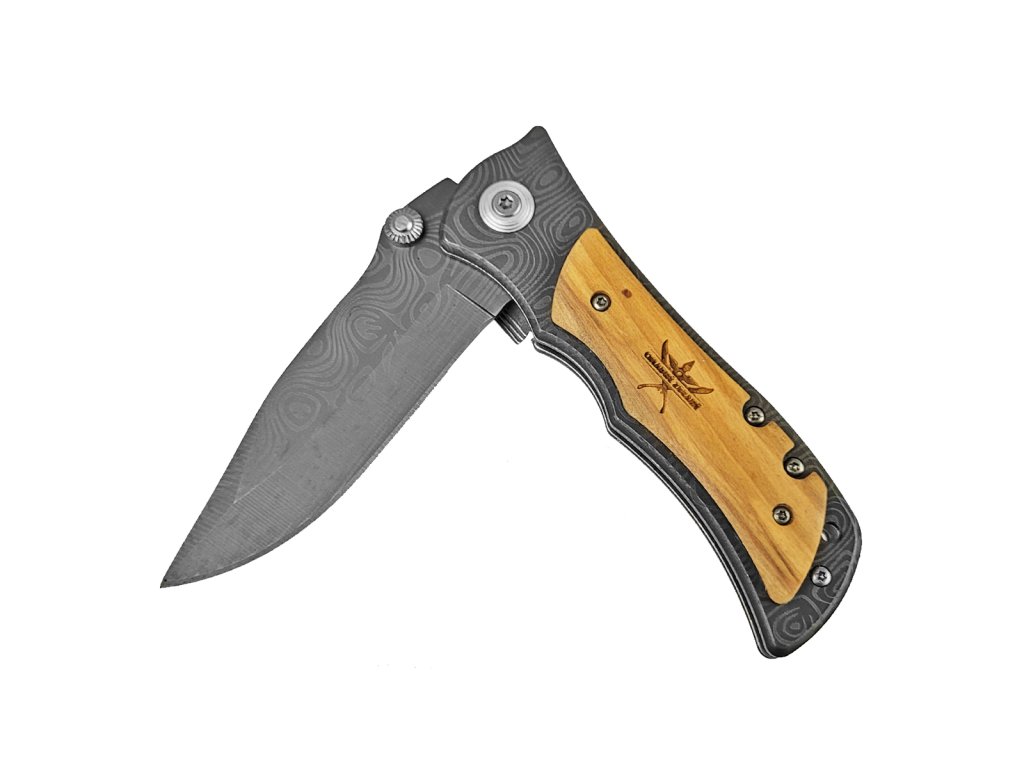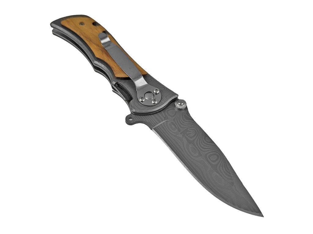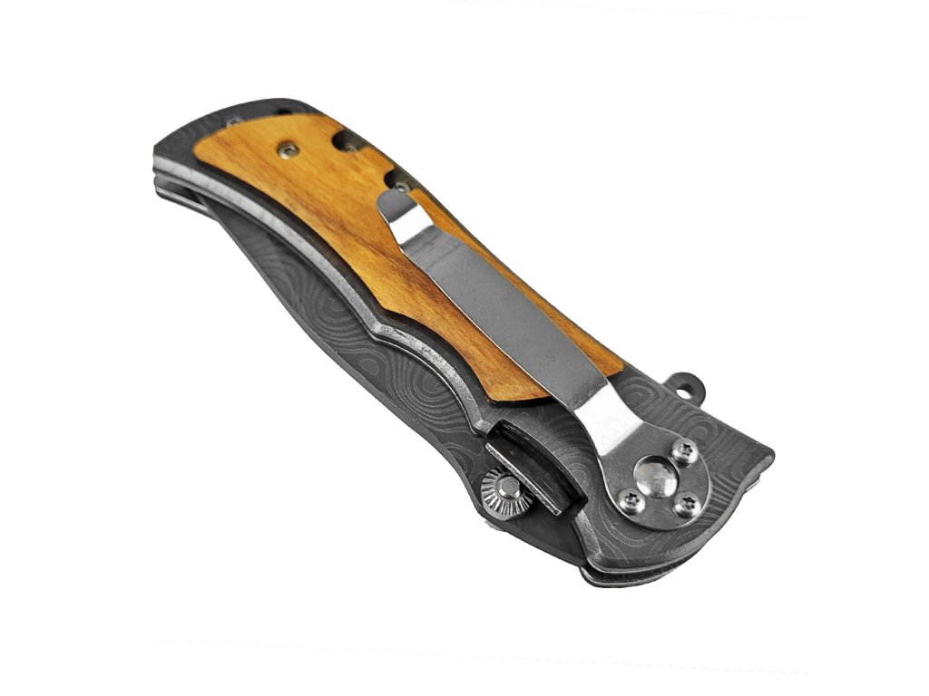 Kvalitný nôž do prírody, na výlet, na huby, k táboráku a podobne. Žiadny plast, iba oceľ a drevo. Čepeľ noža je dlhá 8 cm a je vyrobená z nerezovej ocele 3Cr13. Tá je obohatená o imitáciu damaškovej kresby. Samotné otváranie noža je možné vykonať pomocou jednej ruky, vďaka vyhadzovaciemu mechanizmu. Nôž sa automaticky zaistí poistkou typu linerlock. Rukoväť noža je dlhá 11 cm a tvorí ju kombinácia ocele a dreva. Na črienky bolo použité drevo olivovníka. Nôž má skvelú ergonómiu a drží sa iste a pevne. Na jednej strane nájdeme aj klip na opasok/vrecko, takže nôž môžete nosiť denne pri sebe. Na konci rukoväte sa nachádza prievlak na paracord / šnúru.
