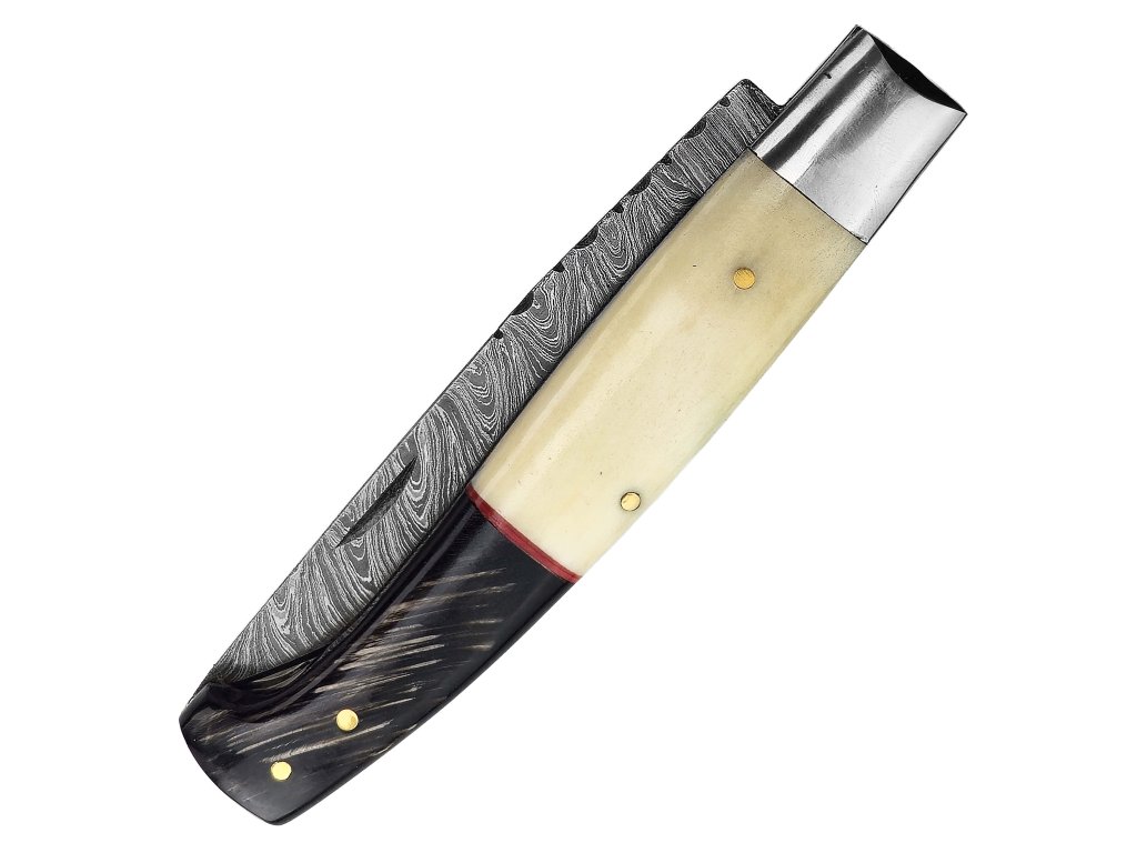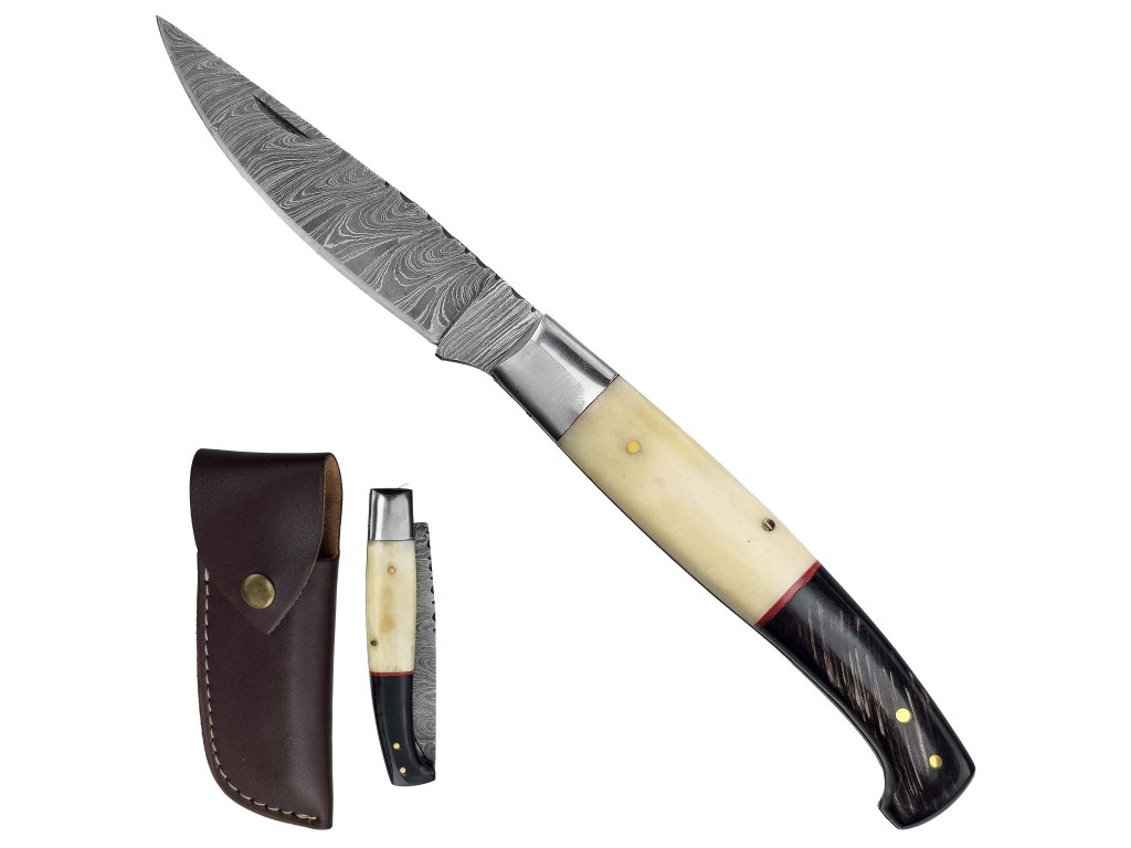 Zatvárací damaškový nôž "BONE TRAPPER" s koženým puzdrom
