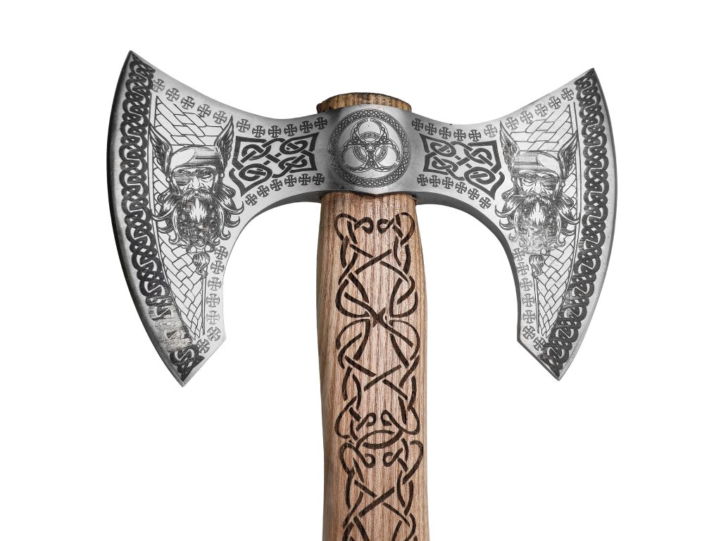 Zdobná sekera „HONOR THE ALLFATHER“ vzdáva poctu severským bohom a bojovníkom dávnych čias. Jej masívna dvojitá hlavica z uhlíkovej ocele je bohato gravírovaná motívmi Odina a severských symbolov. Sekera pôsobí majestátne, a napriek tomu si zachováva čiastočne funkčné ostrie - nie je plne ostré, ale dostatočne jemné pre ľahšiu prácu alebo dekoratívne účely.